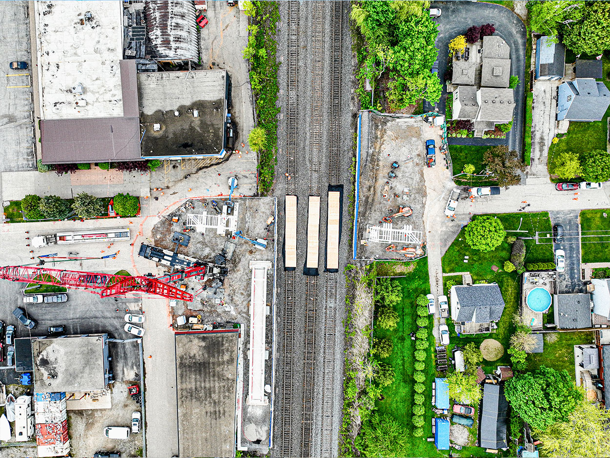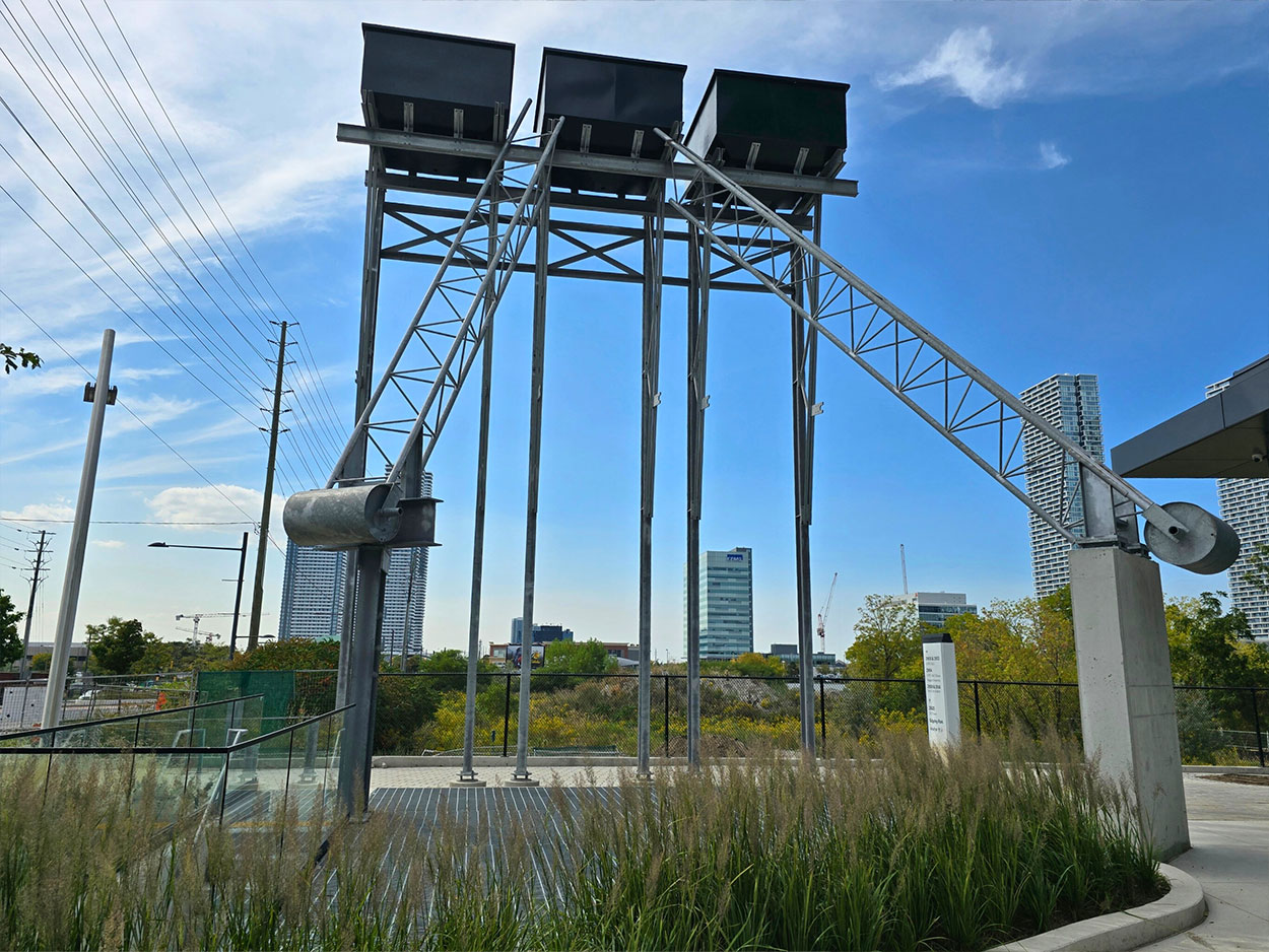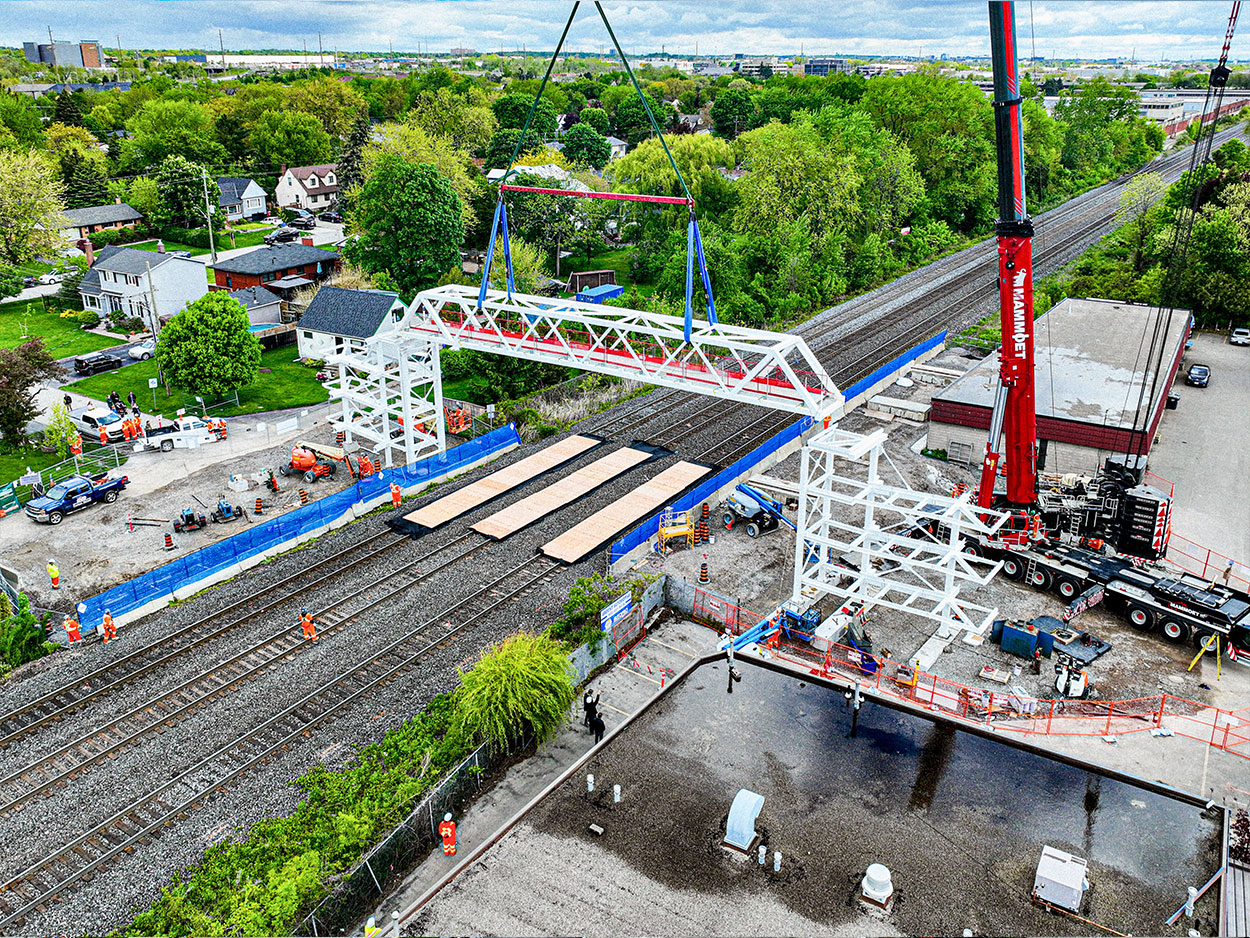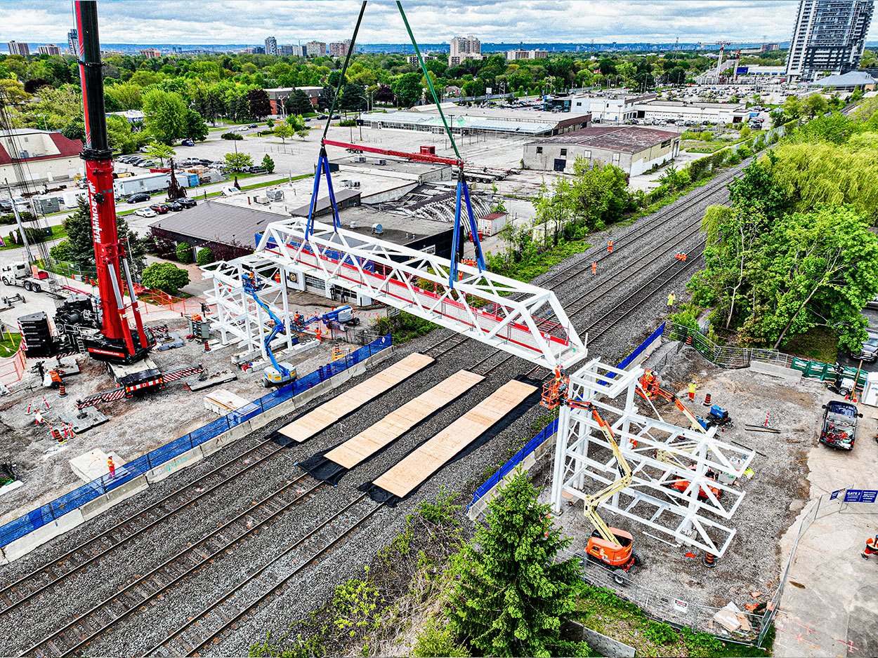 The new Drury Lane Pedestrian Bridge replaces the original 53-year-old structure with a modern, 60-tonne white steel Warren truss bridge. Officially opened on October 31, 2025, the bridge provides a safe and accessible connection between the Glenwood neighbourhood and Fairview Street over the Lakeshore West rail corridor. The structure was designed with increased clearance to support future rail electrification and includes fully accessible ramps for pedestrians and cyclists. Constructed by EllisDon for Metrolinx, the project was completed in approximately eight months, with minor landscaping and site restoration continuing after the opening.