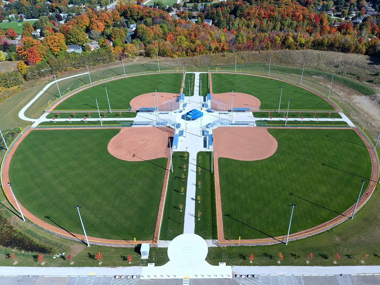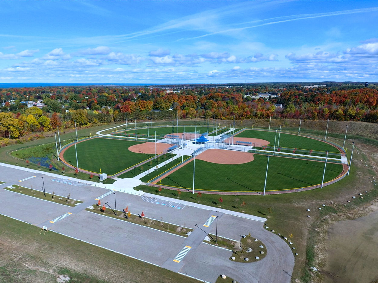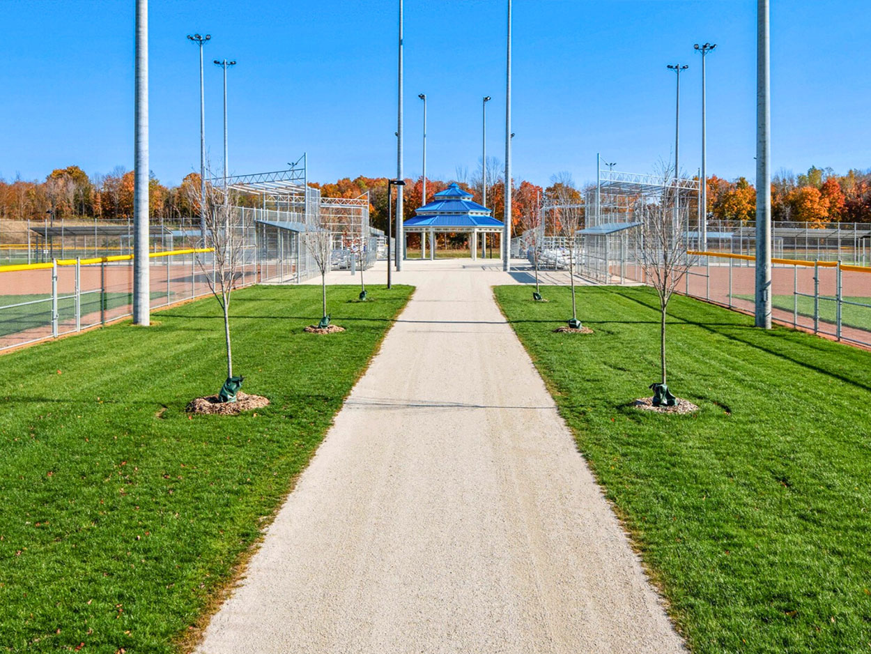 The Lamont Sports Park is a multi-field recreational facility located on Concession 6, south of Port Elgin in the Town of Saugeen Shores. Identified through the Town’s 2016 Recreation Master Plan, the project addresses the need for additional recreational amenities to support community growth and includes four ball diamonds equipped with dugouts, lighting, and on-site parking.
