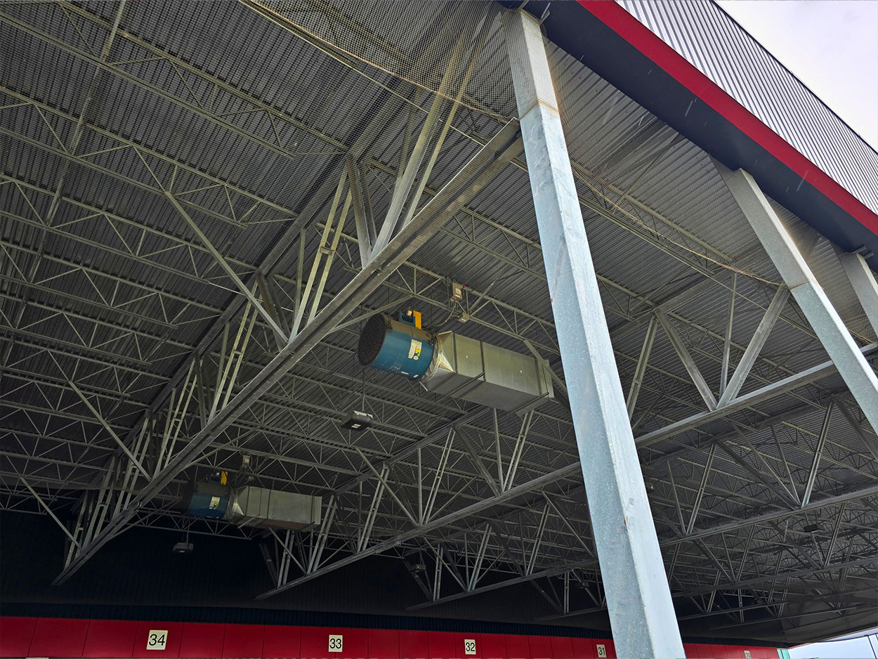 Structural steel frames forming the east and west pedestrian ramp walkways.
