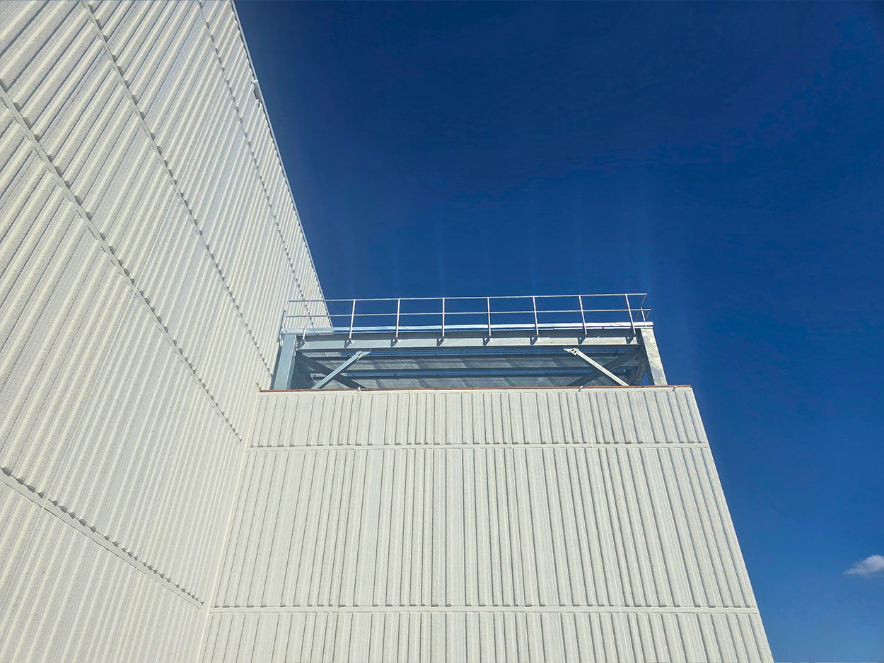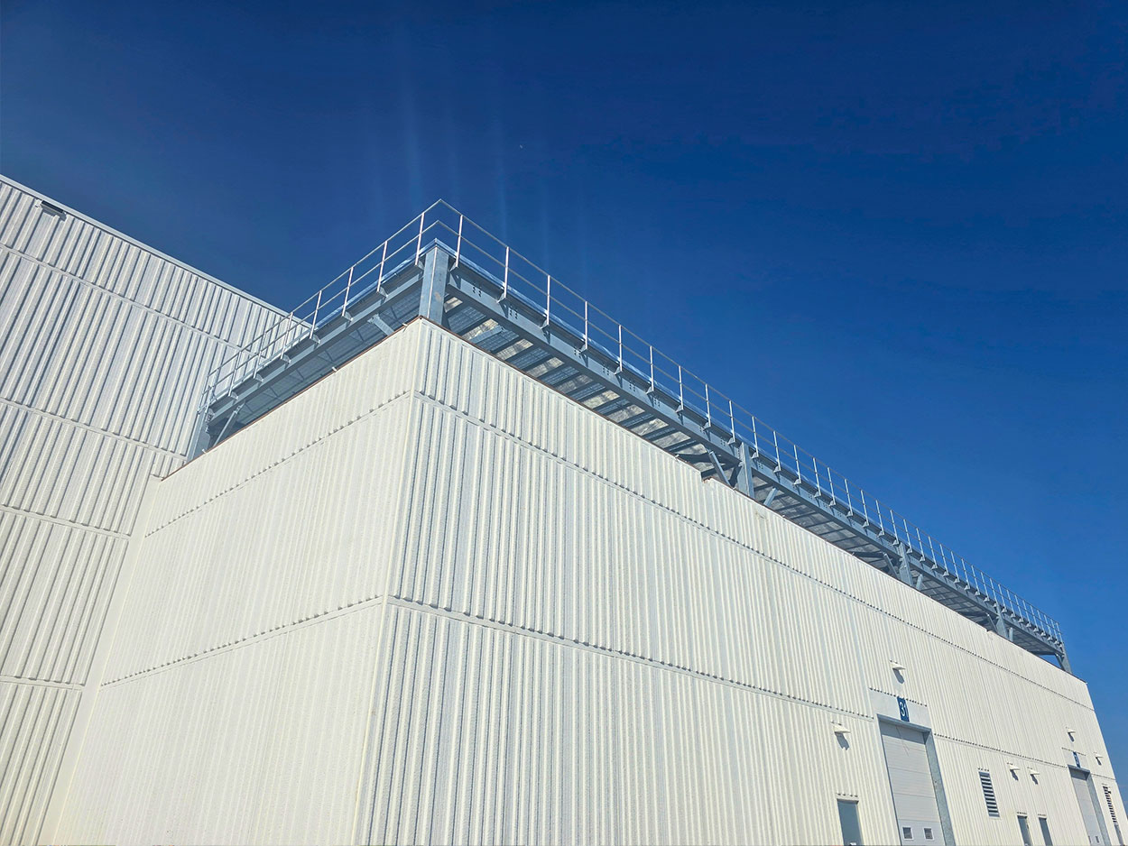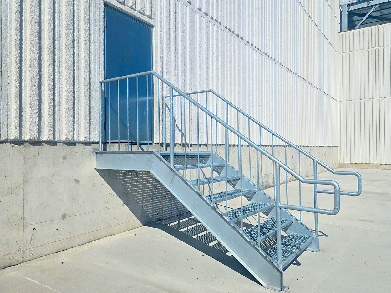 Exterior bollards, staircases, and a platform with railing over the mechanical room are installed around the Vaughan warehouse to improve safety, accessibility, and site functionality. Bollards protect building walls, doors, and pedestrians from vehicle impact in high-traffic loading and parking areas. Exterior staircases provide safe access and emergency egress between different elevations, while the elevated platform with railing allows secure access to mechanical equipment for maintenance and inspections while preventing fall hazards. Together, these features enhance worker safety, protect critical infrastructure, and support compliance with building and safety codes for industrial facilities.